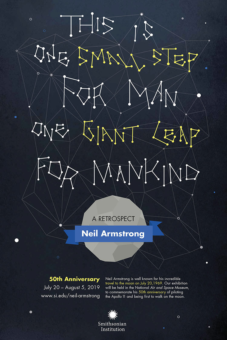 This poster is for a fictitious retrospective of a famous astronaut, Neil Armstrong. The retrospective is in the Smithsonian Institution to commemorate his 50th anniversary of being the first person to walk on the moon.